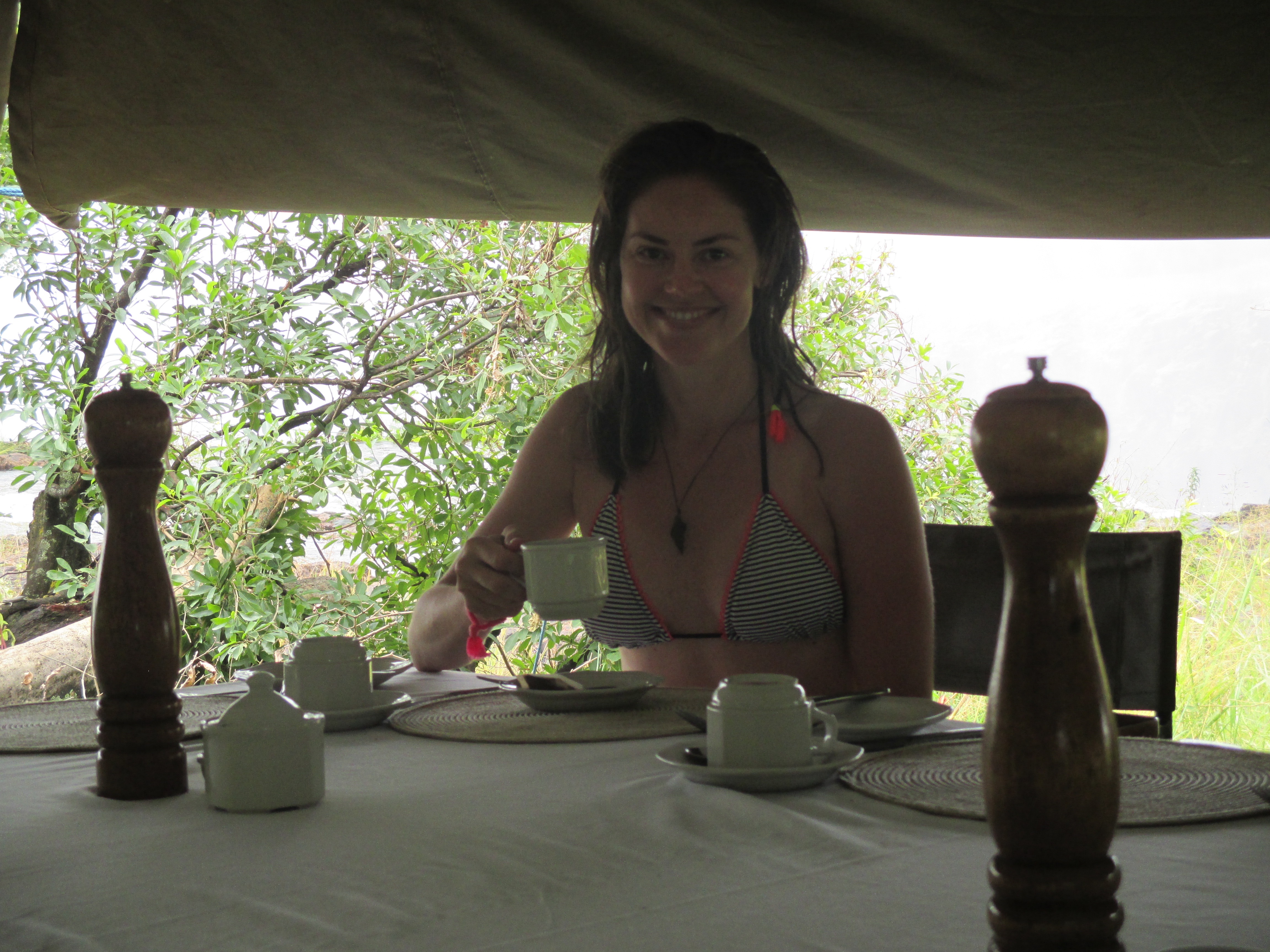 We met our guide at the dock and took a small boat over to Livingstone Island. There we disembarked and walked toward the semi-permanent dining tent and bathrooms. We changed into our swim suits (all while with a beautiful view of the raging river) and met our guide again to make our way to the famous Angel’s Pool at the waterfall’s edge.