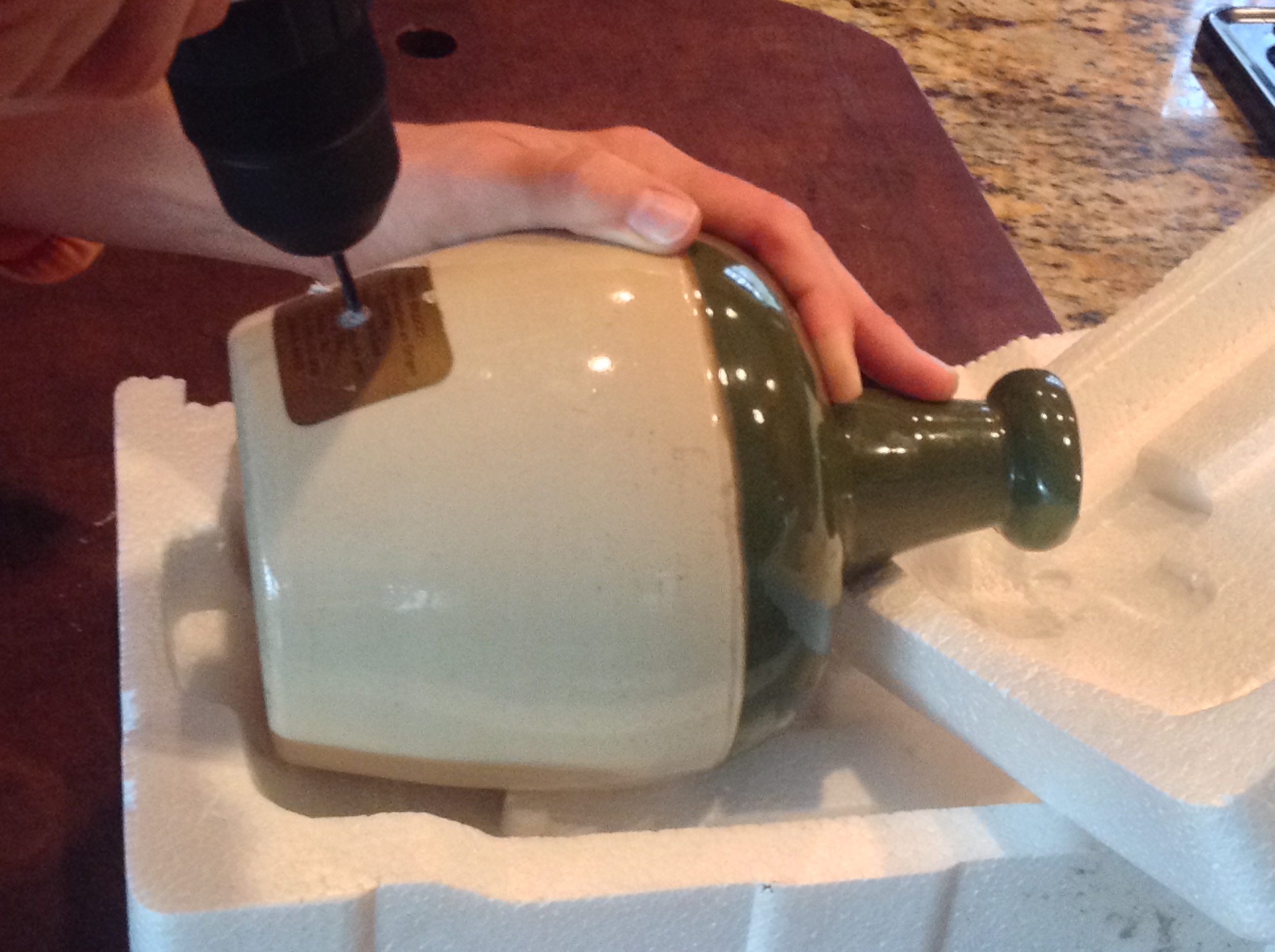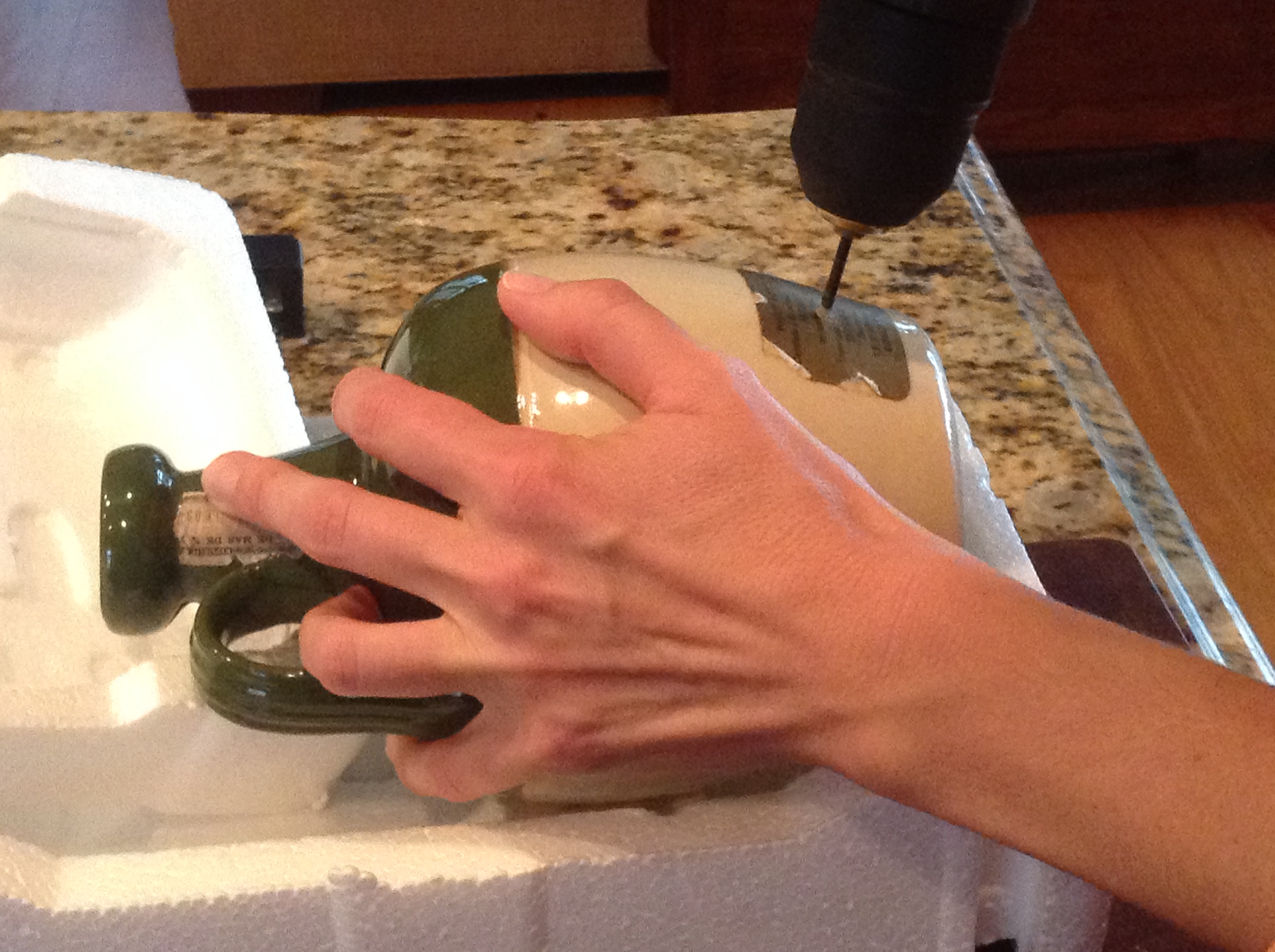 First, I had to drill a hole through the bottle so that I could pull an electrical wire through it and through the opening of the bottle. The darn bottle was a lot thicker than I thought it would be. It took me probably a total of three hours spread over the course of a few days to finally get through. I rested it on some styrofoam from a package so it wouldn’t move around.