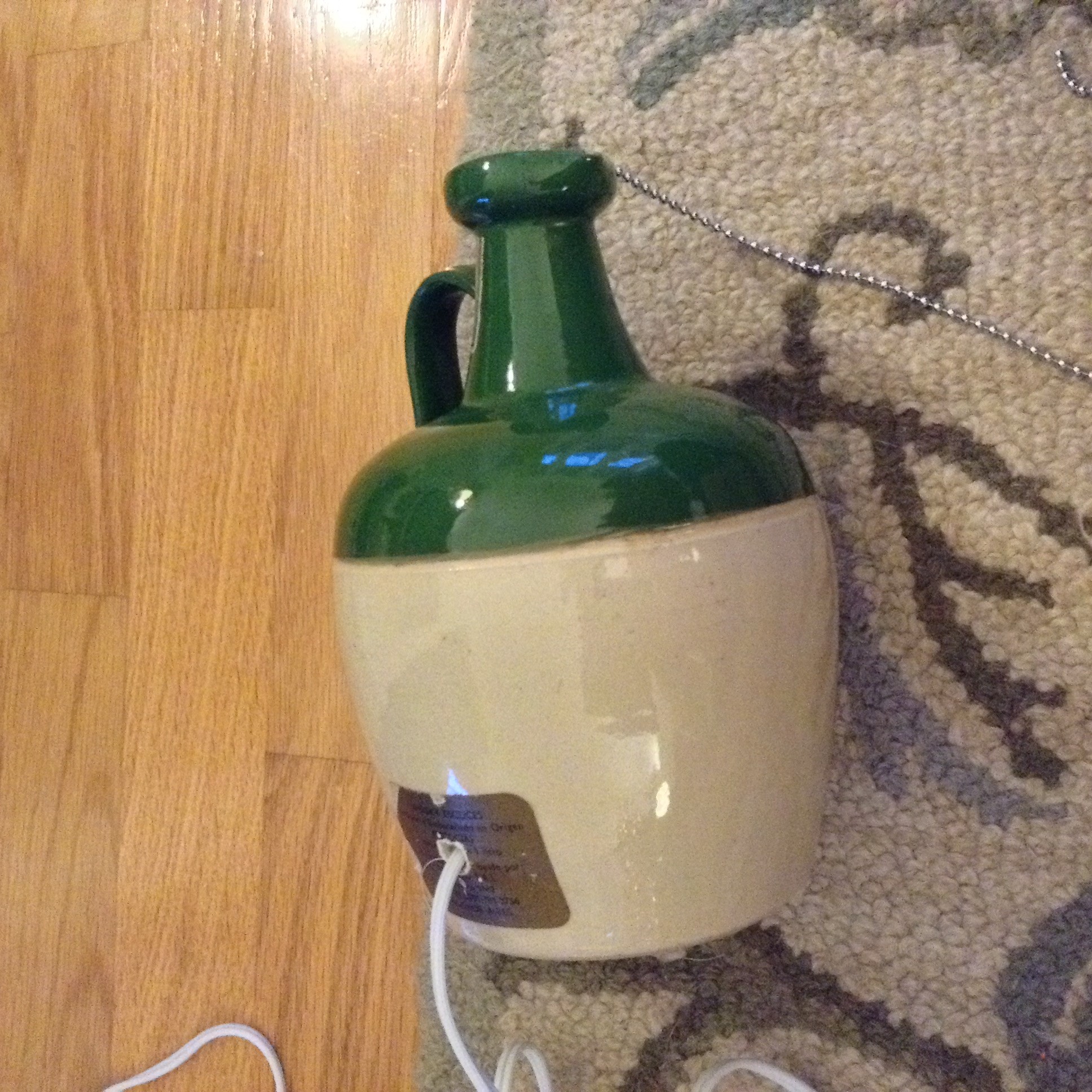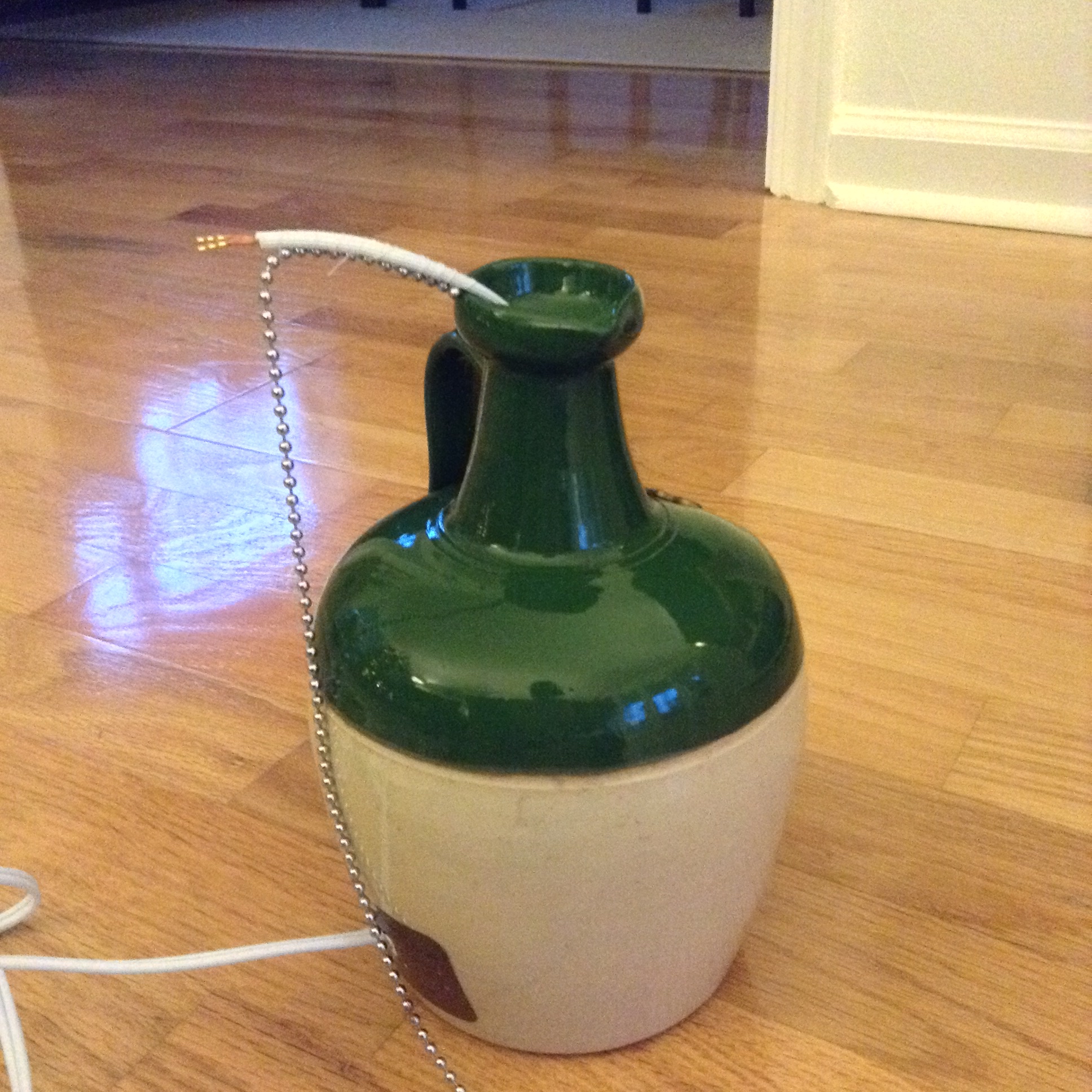 Meanwhile, I have been on the look out for the perfect lamp for my bar. I’m not the kind of person who just buys something I need to be done with it, I want to get the perfect thing I need. So I’ll go without it for a while until I find that perfect thing or can figure out a way to get my mom to make it. My mom is an expert at making everything. She can make the most amazing things out of what the rest of us would consider nothing. So finally it occurred to me that my mom and I could make a lamp out of all those wine corks. Brilliant! So I proposed the idea to her and she agreed. But as it often happens with my very creative mother, when talking about one idea a million others spring into her head and somehow we went from making a lamp out of my wine corks to making a lamp out of an old whiskey jug.