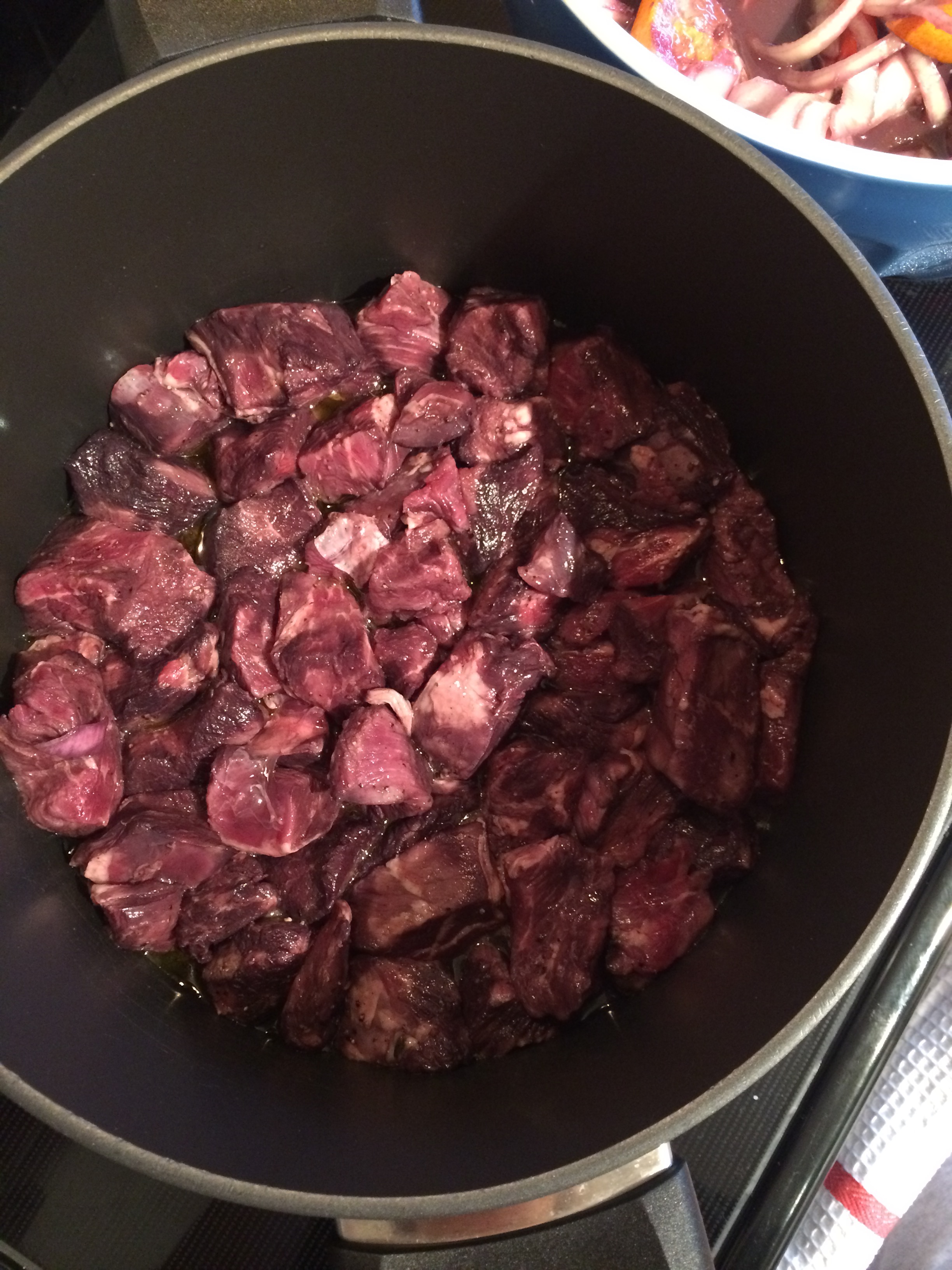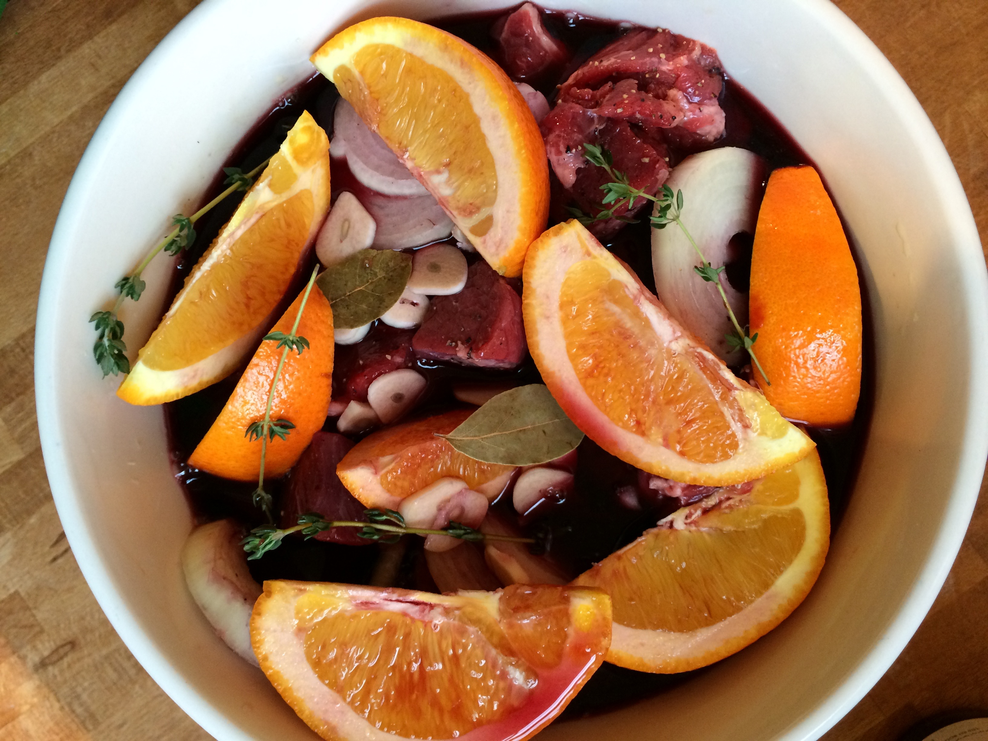 One thing I did differently was I omitted the oranges in the stewing portion. I put the oranges in for the marinade and just took them out when it was time to cook the meat and veggies. In reading the original blog post I found that some people complained of a slightly bitter taste because of the orange peel, which is why I chose to omit it from the cooking portion.