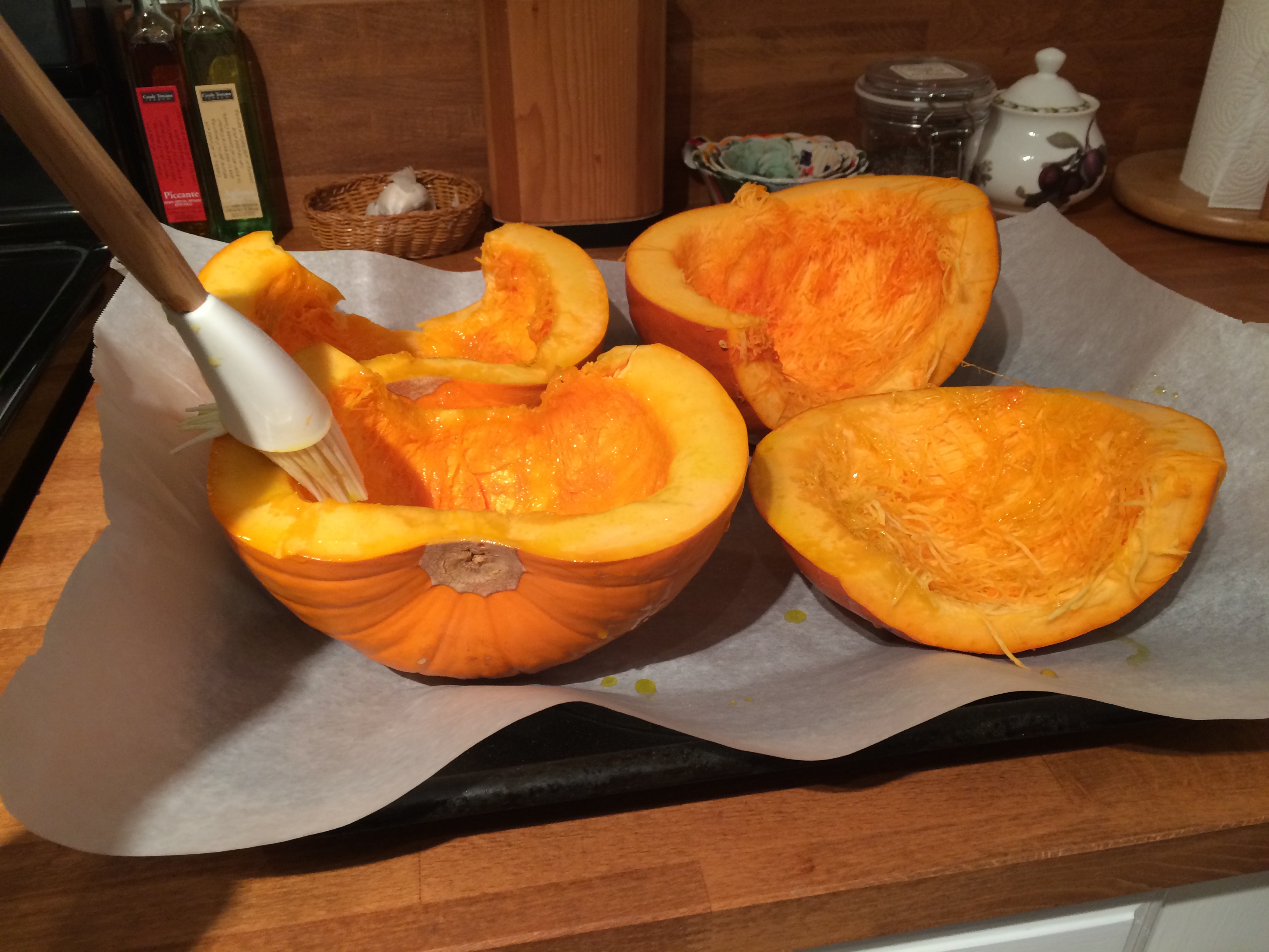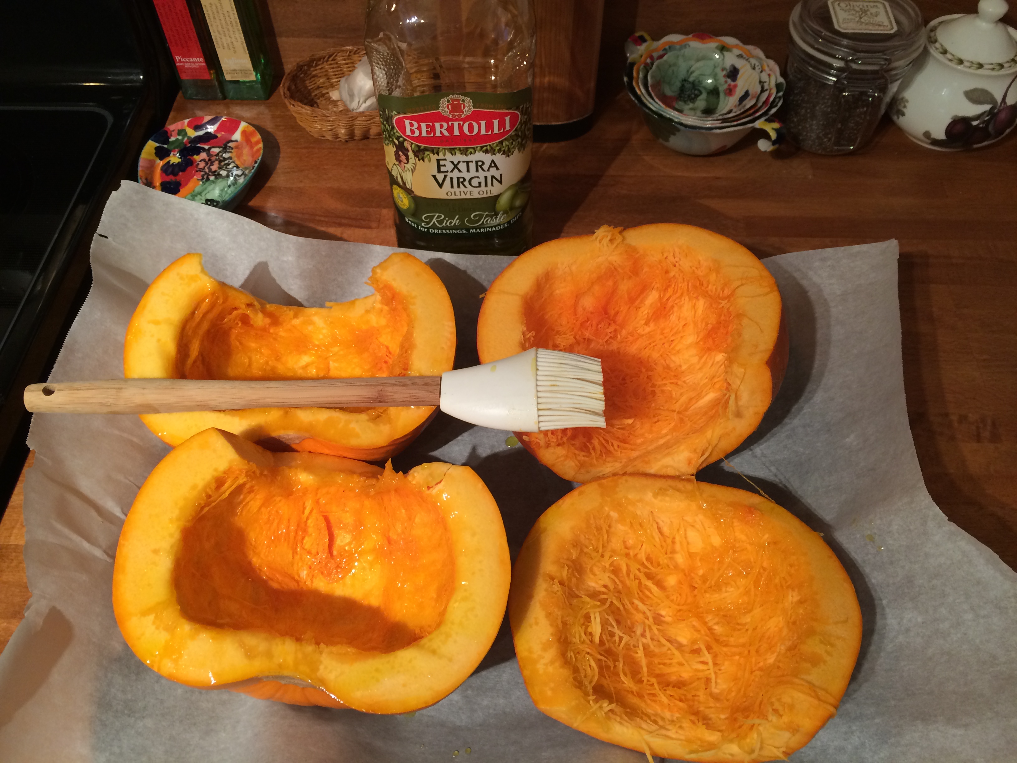 - Brush the inside of the pumpkin with olive oil and place face down on the baking sheet
