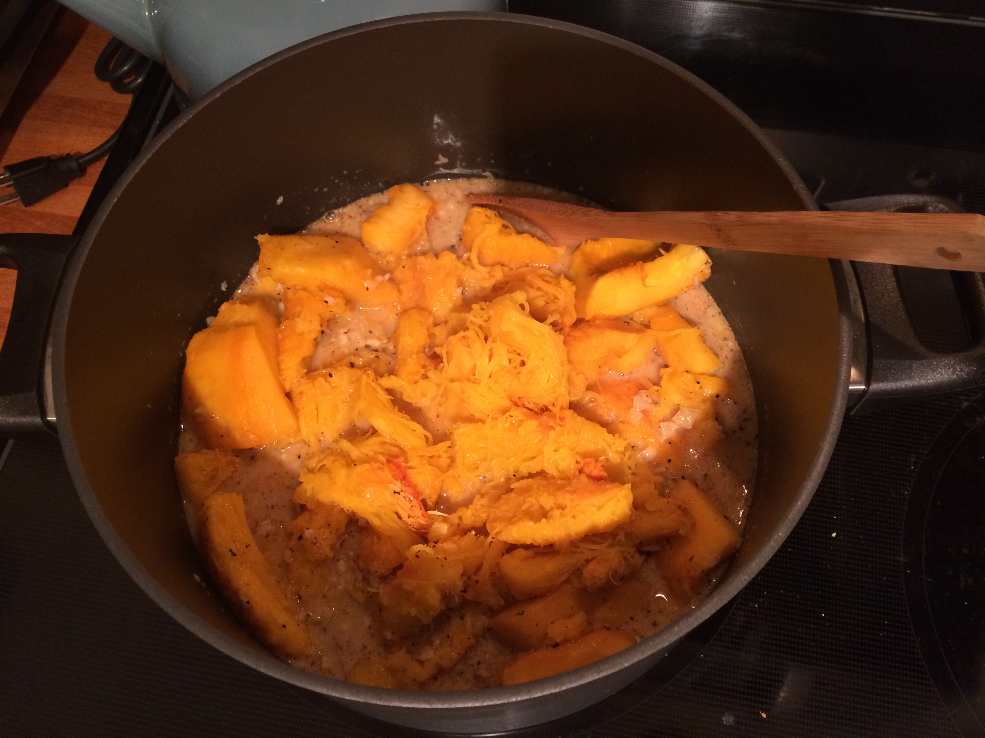 - Add the peeled pumpkin, veggie stock, coconut milk, salt, pepper and nutmeg to pot. Bring to a simmer for a few minutes.