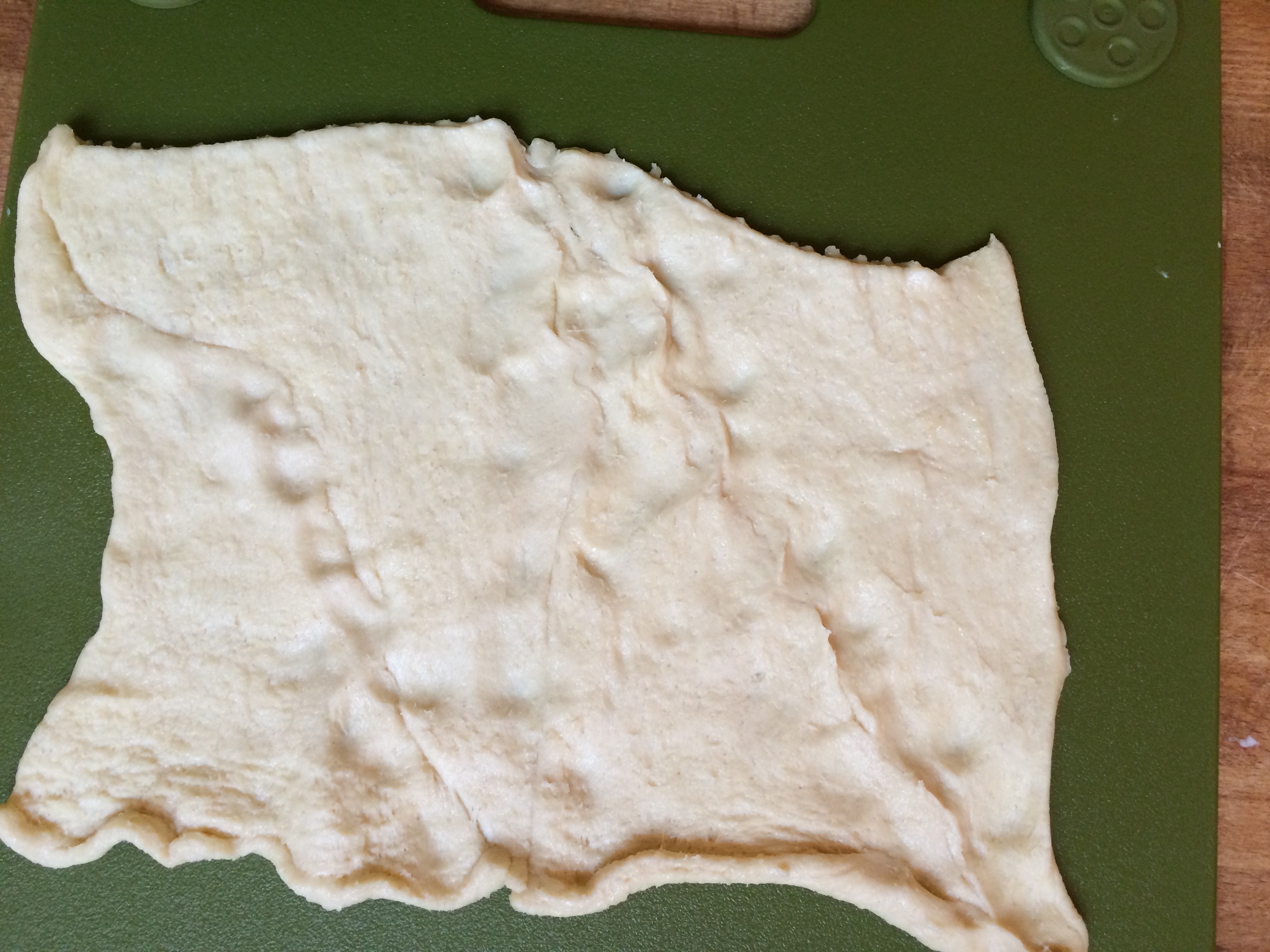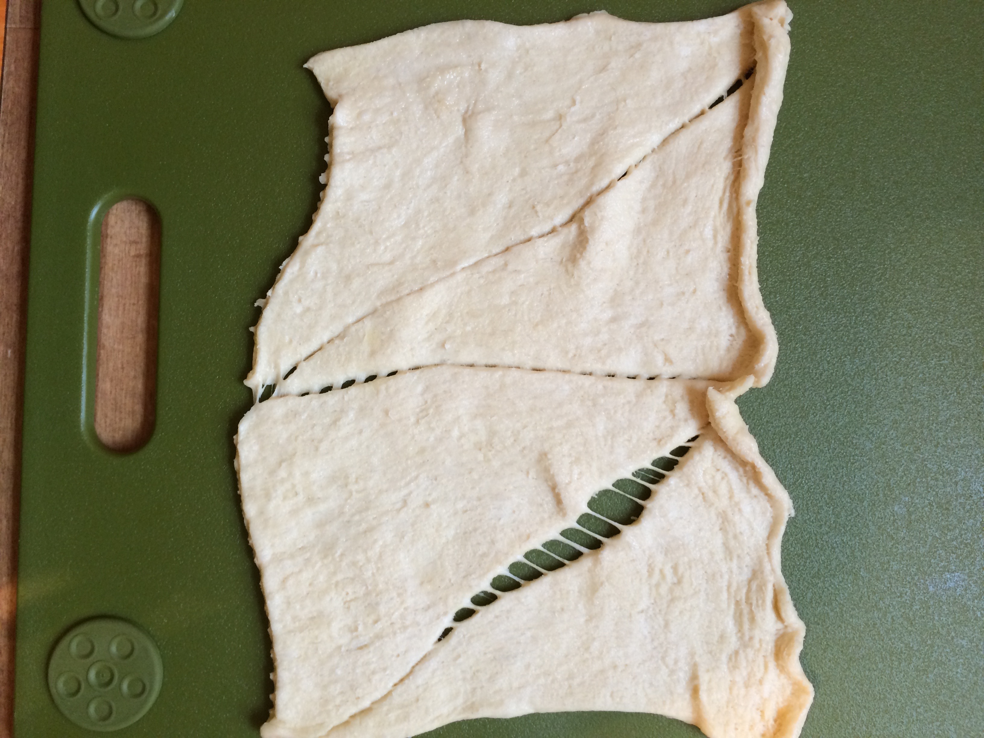 Take your crescent roll and divide into two rectangles so you can make two pin wheels. Take one of the rectangles and pinch together the perforation to make one sheet