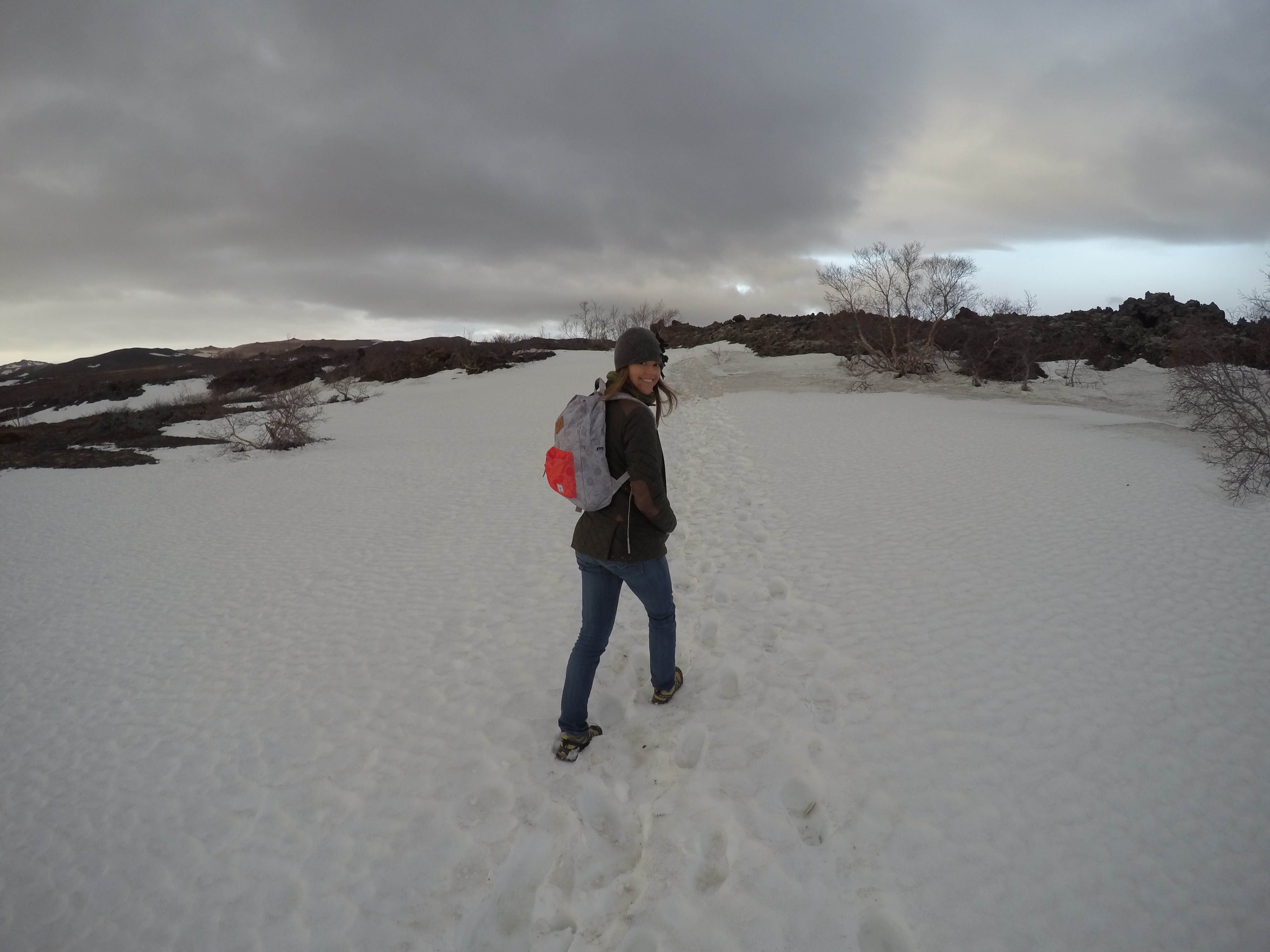 At the bottom of the volcano we found the trail that would lead us to Grjótagjá. After about 30 minutes of walking through lava fields with our bathing suits under our clothes, through the snow and weird mossy vegetation, we finally get to… a perfectly paved road. WHAT?