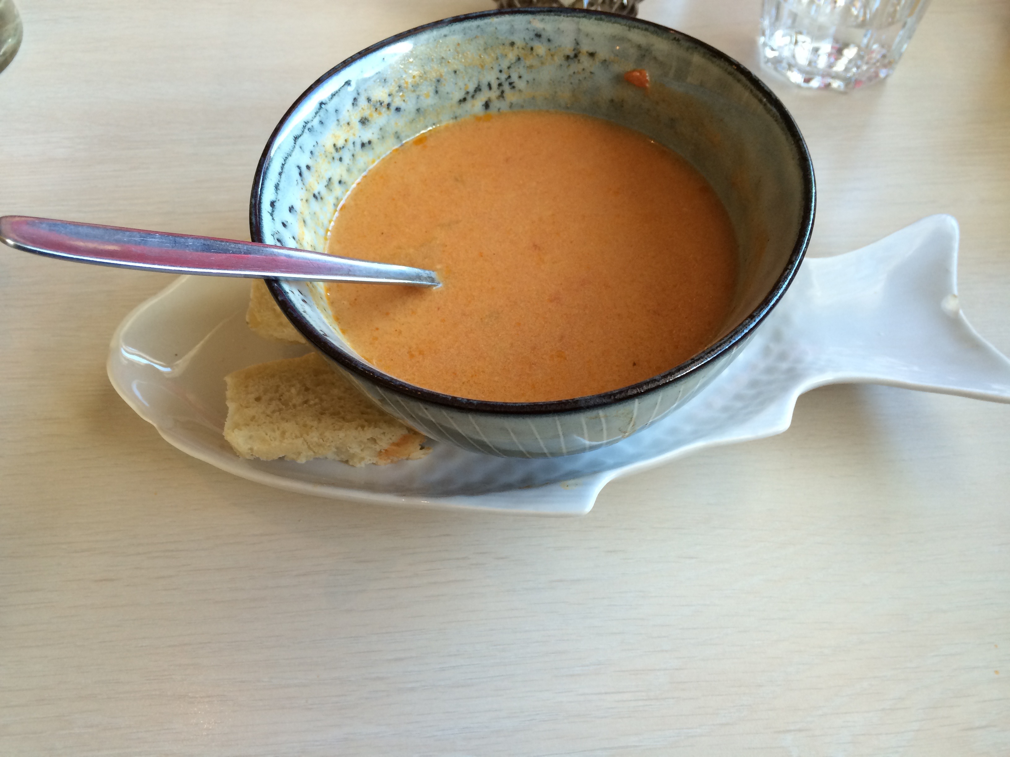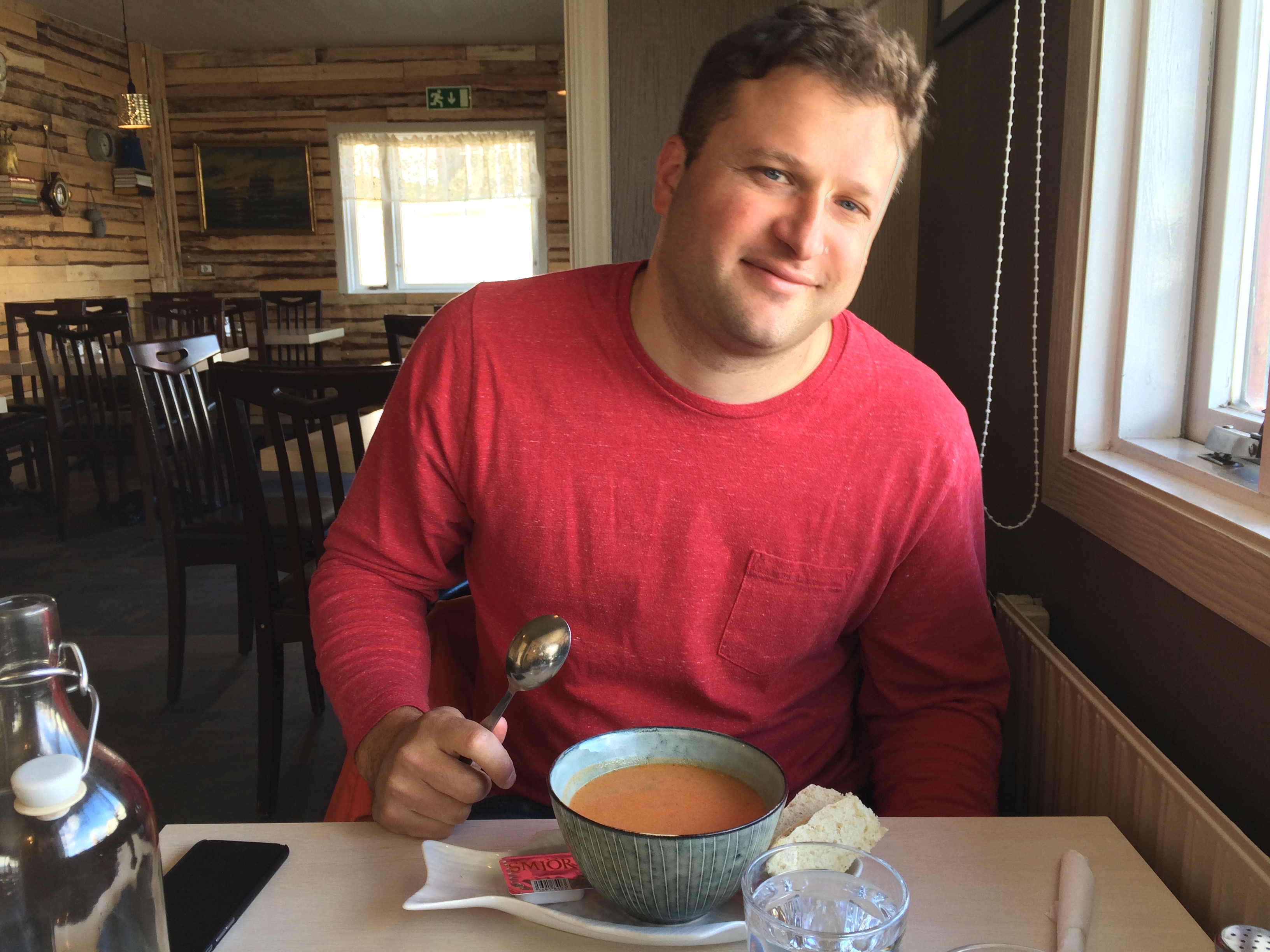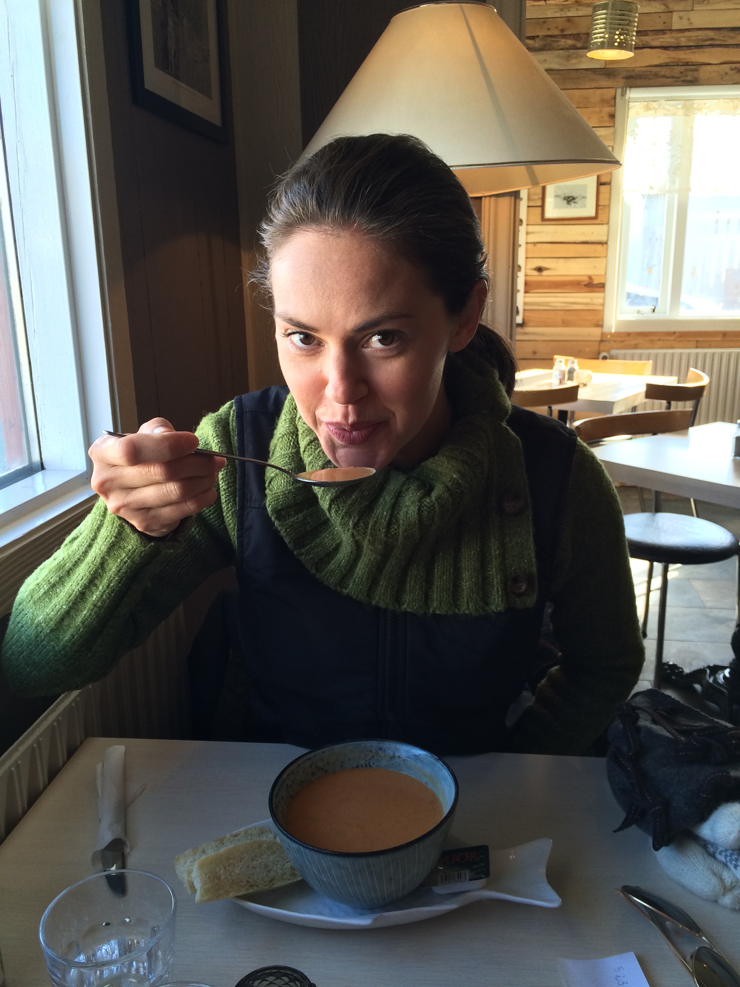 After the freezing ride we needed something to warm ourselves up with and now we were on day four so we wanted to vary from our hot chocolate and tea. So we went to a little restaurant painted yellow right off the dock called Naustið. As always, I really cannot say this enough, we were greeted warmly and sat immediately. We both ordered the fish soup of the day (Marc ordered his minus the fish…what?).
