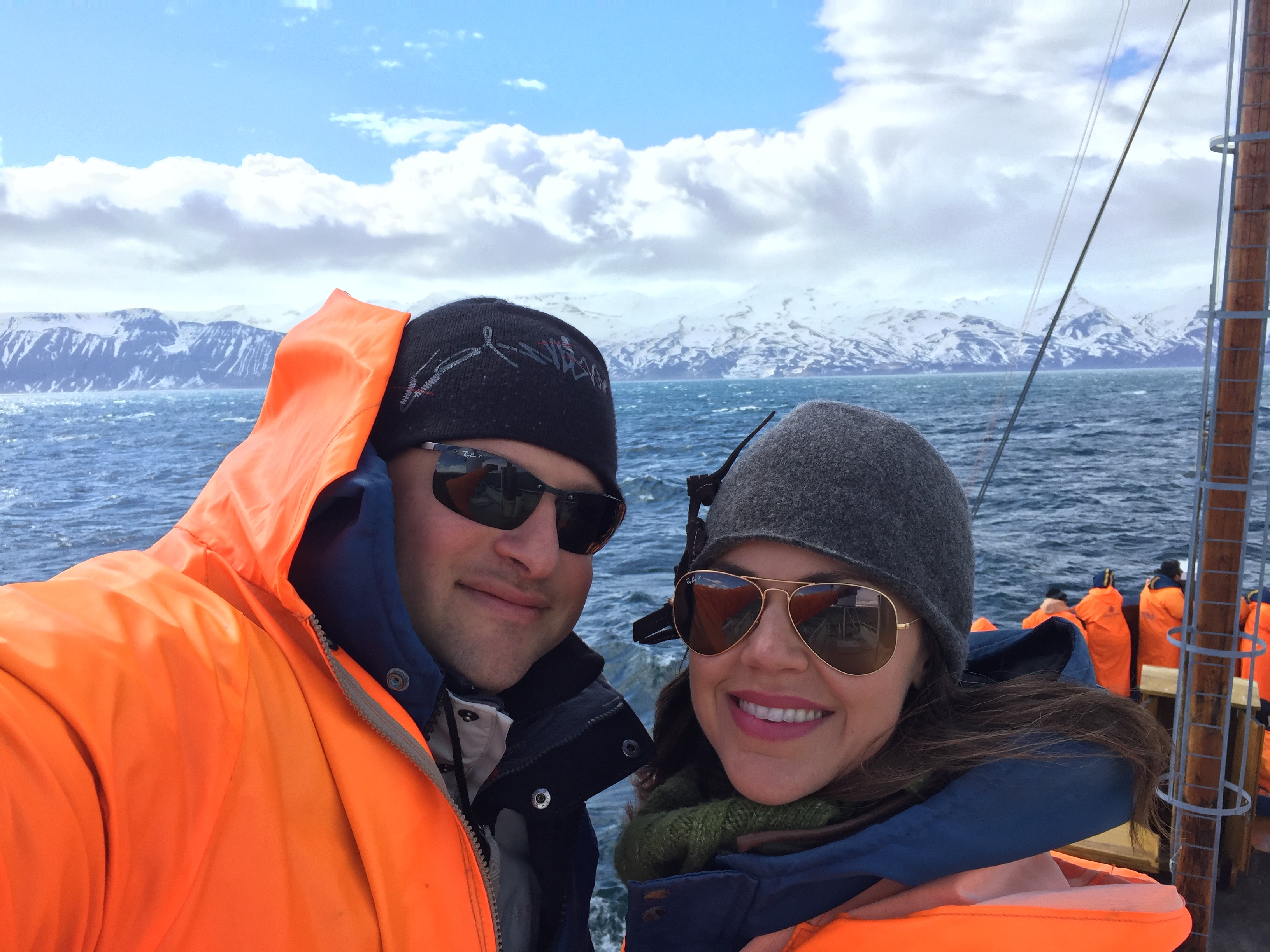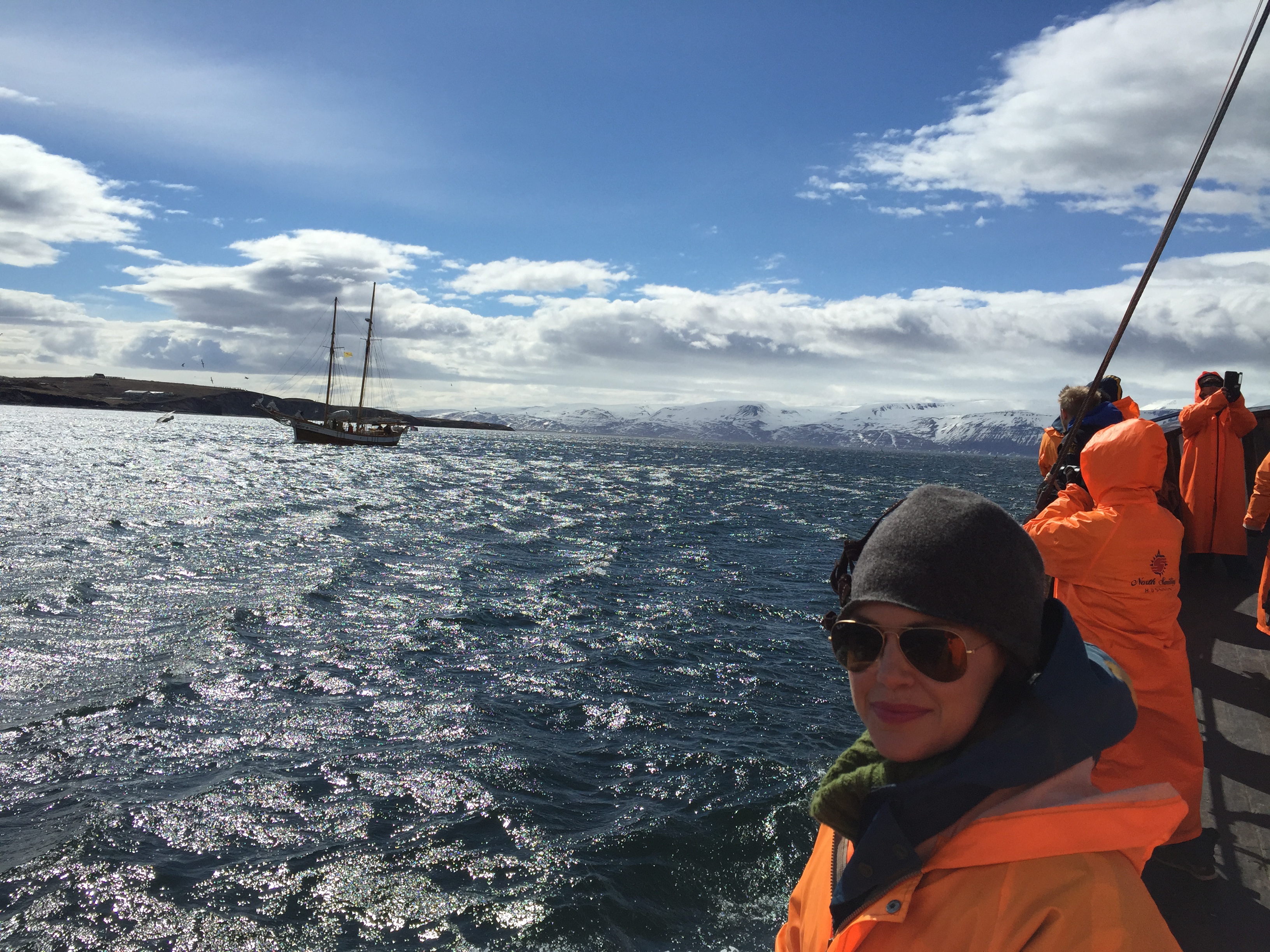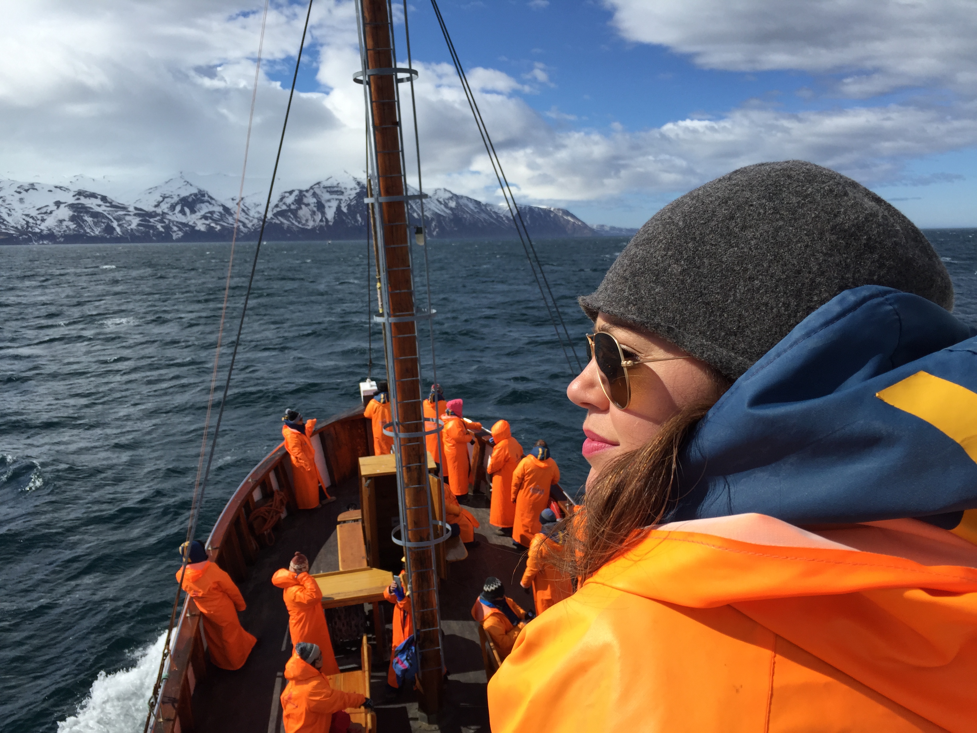 That day was our first beautiful, full sun, no clouds day of our trip. We picked the perfect day for being out at sea. But as always, since it’s Iceland (guys, the word ice is in the name) we bundled up in layers. Plus, North Sailing provided each customer with a blue waterproof jumpsuit AND a full-length bright orange water proof jacket.