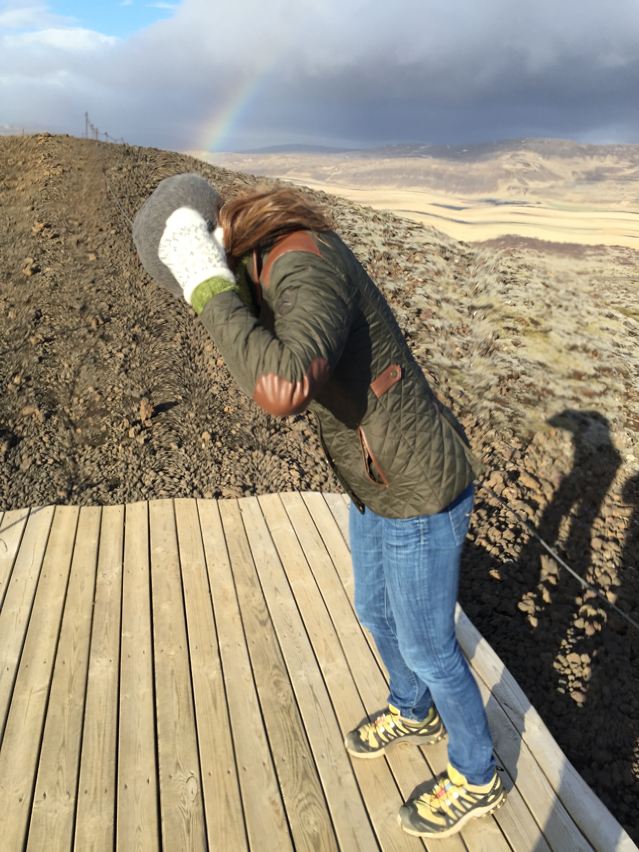 The good news is there was a beautiful rainbow so even though we were freezing and fighting the wind for our lives, at least it was a magnificent view. I wanted to test out the strength of the wind so I planted my feet, faced the wind head on and let my body fall forward to see if the wind would catch me. Yall, I am not kidding when I say I put complete trust in the strength of that wind and it did not fail. It held me upright. I threw my full body weight into the wind and I did not fall. That’s some serious wind they’ve got there in Iceland. Marc and I were literally locked arm in arm fighting the wind to get down from the mouth of the volcano.
