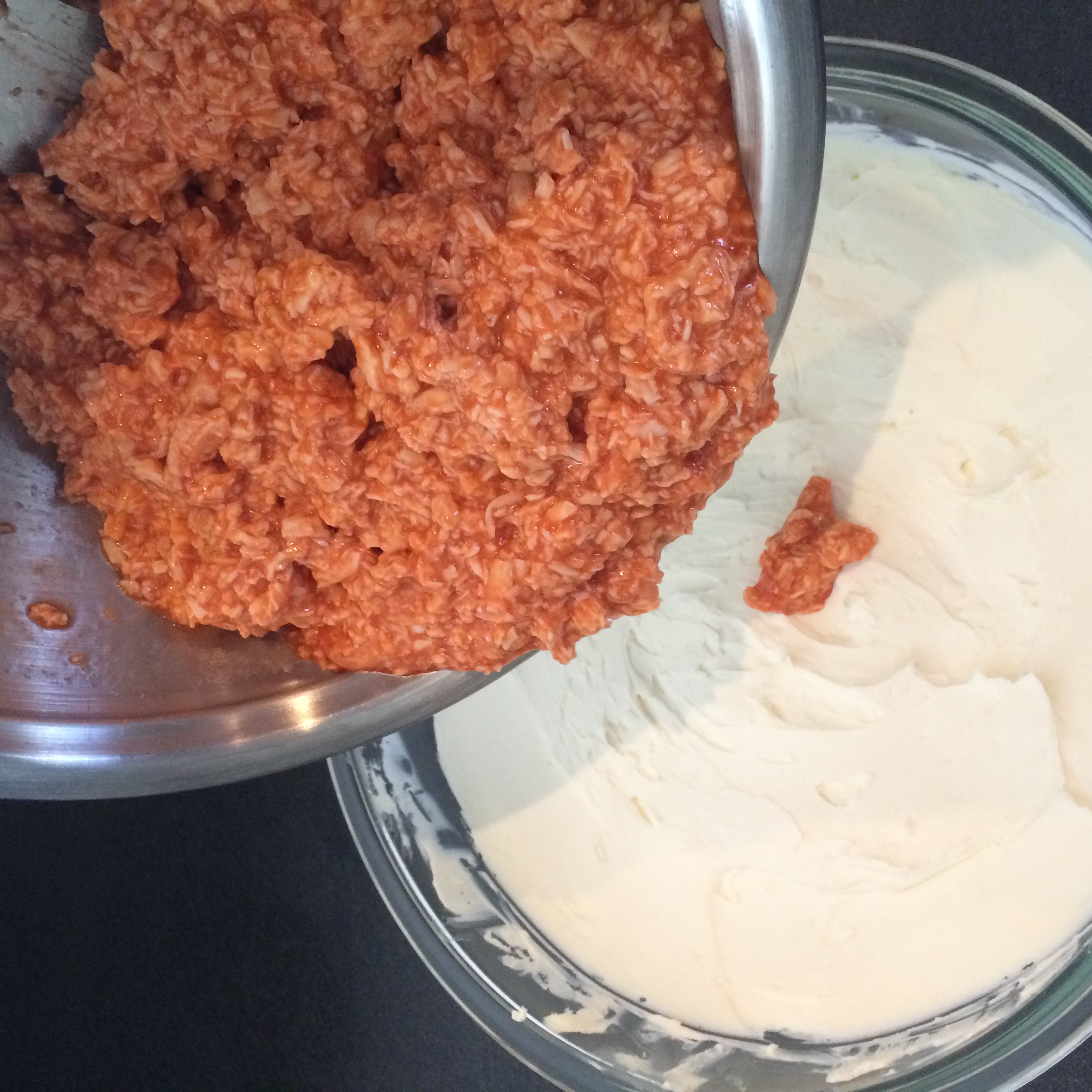 - Pour the chicken mixture over the cream cheese in the pan and spread evenly