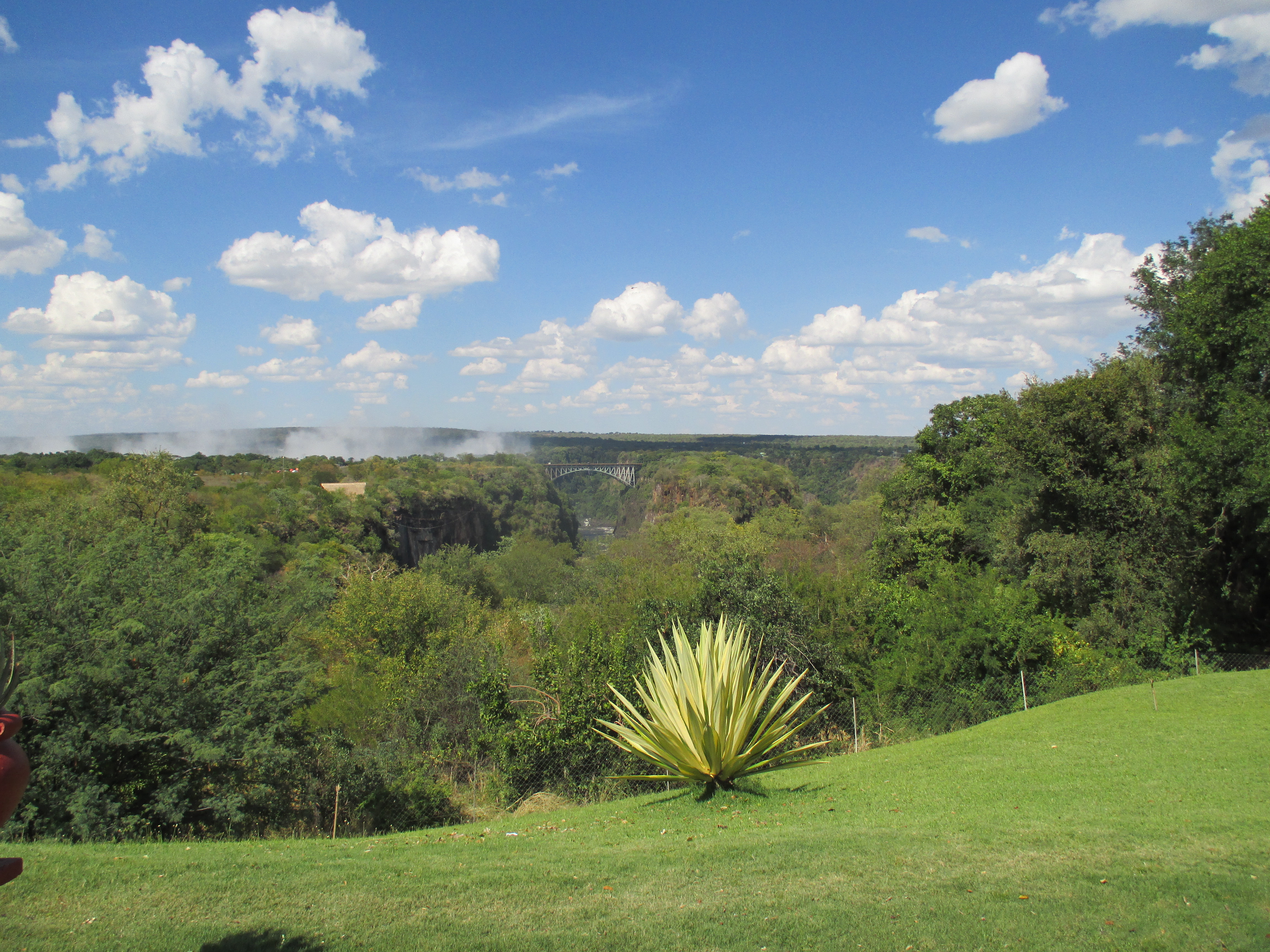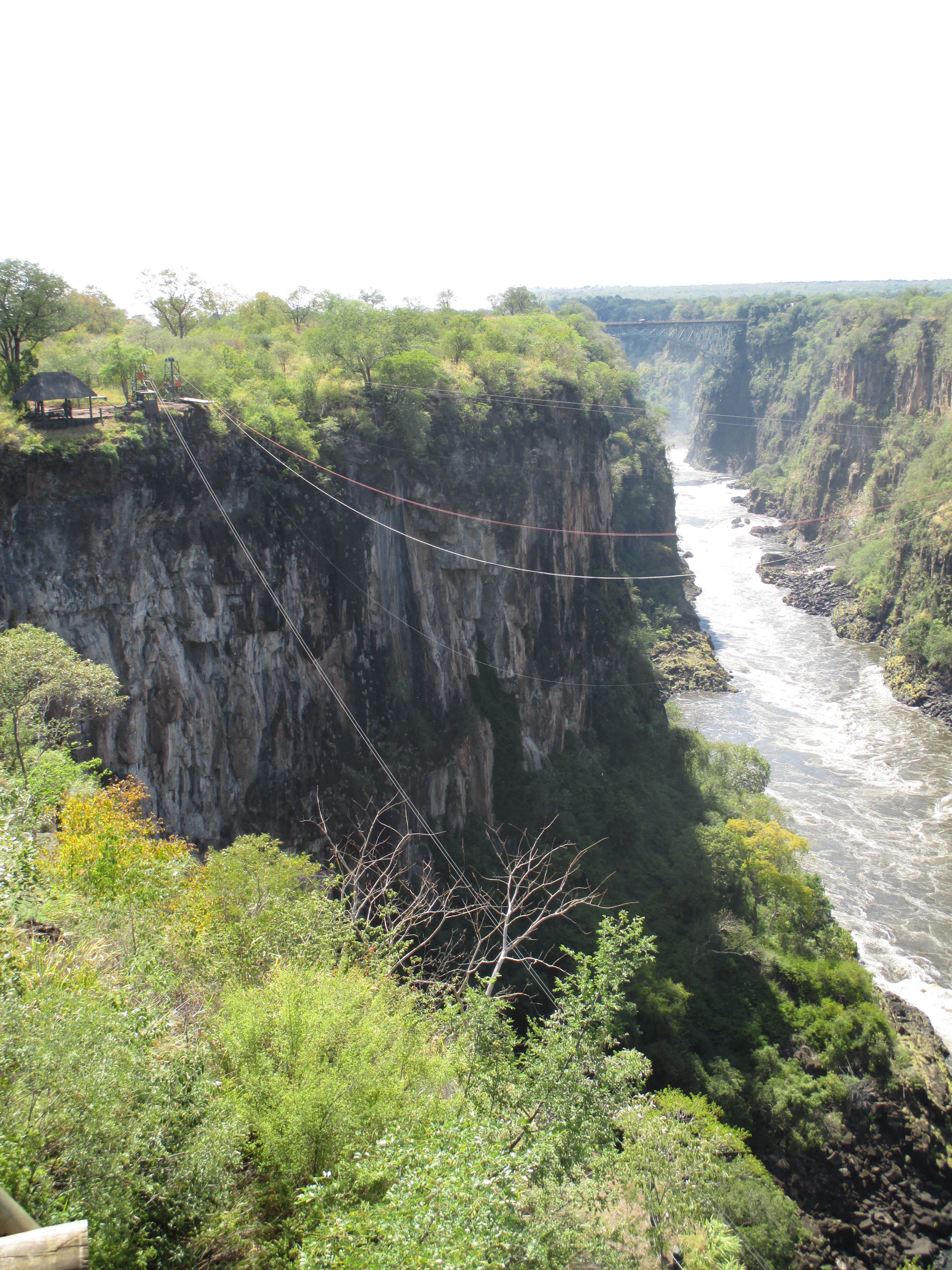 The Stanley & Livingstone Private Game Reserve is about 20 minutes outside of the town of Victoria Falls. On weekends we are on our own with transportation. Thankfully there is a lovely young Zimbabwean named Owen who seems to be the town taxi driver assigned to transport all the Nakavango volunteers to and fro. He picked us up early Sunday morning and drove us to the Wild Horizons high wire facility which is a thatched platform on the edge of the gorge overlooking the Zambezi River. That’s where adventure seekers check in and the not so adventurous can sit, have drinks and a yummy lunch at The Lookout Cafe (what they call the facility) while watching others zip around in the air.
