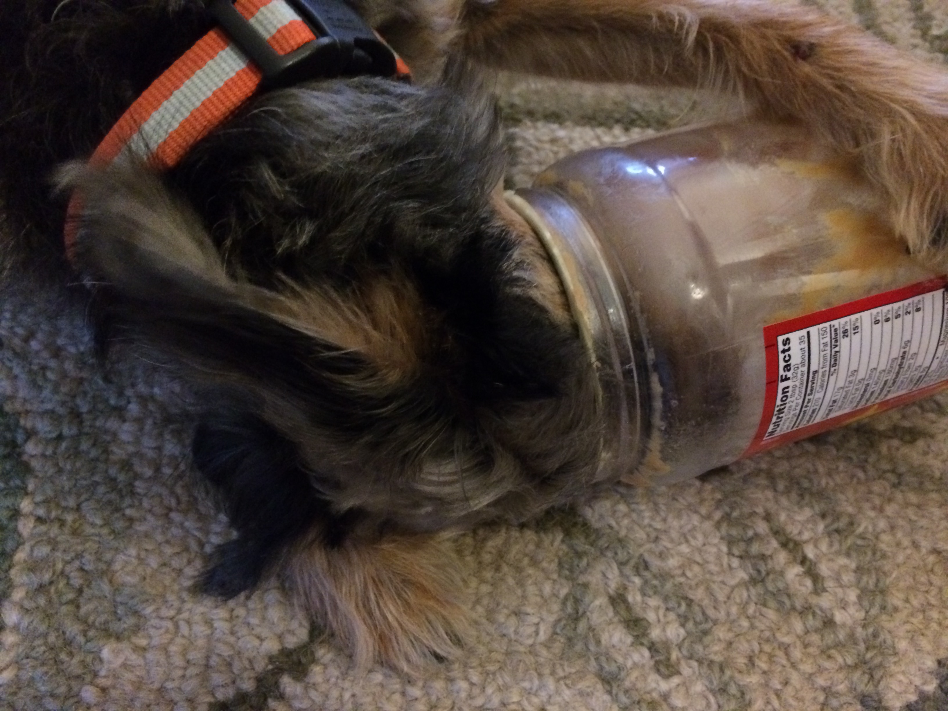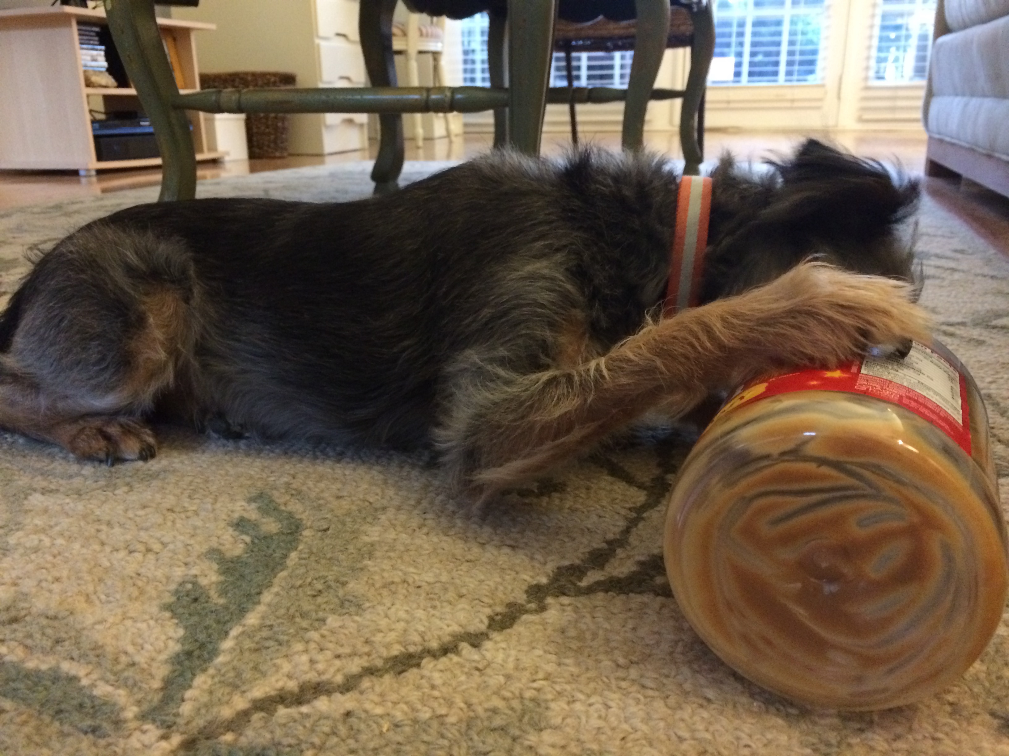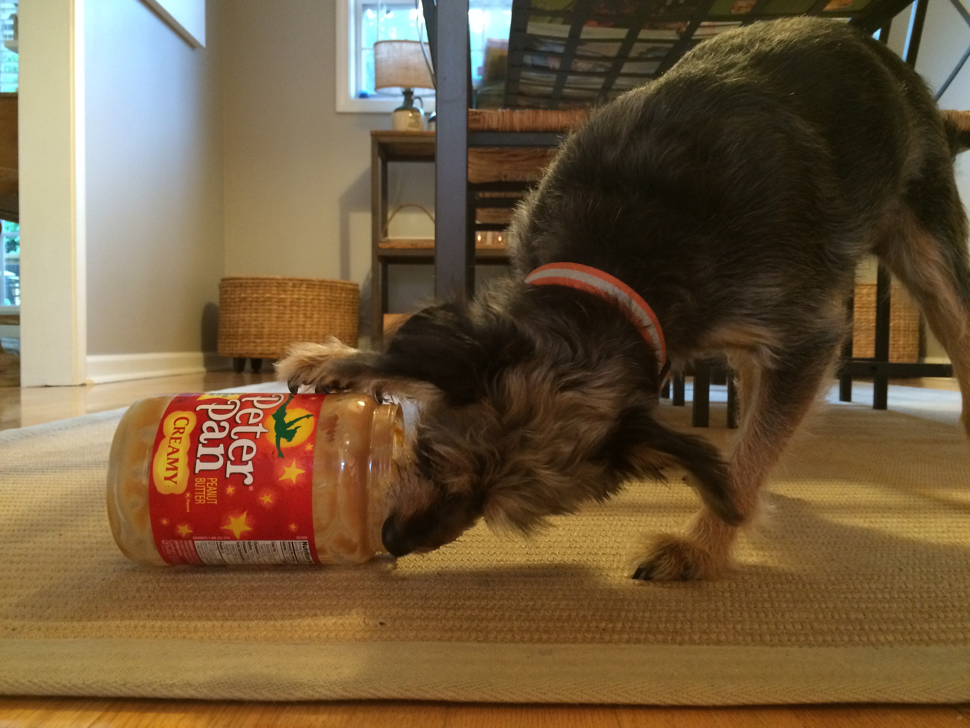 Every night I fill Pooka’s Kong with peanut butter, freeze it overnight and give it to her when I leave the house. When I grab my keys it signals to her to run to the kitchen and stare at the freezer until I give her the kong. This is a creature of habit I’m dealing with. Wonder where she gets it from? Anyway, her favorite day is when I get to the bottom of the peanut butter jar and give it to her to finish cleaning up. Pure joy.